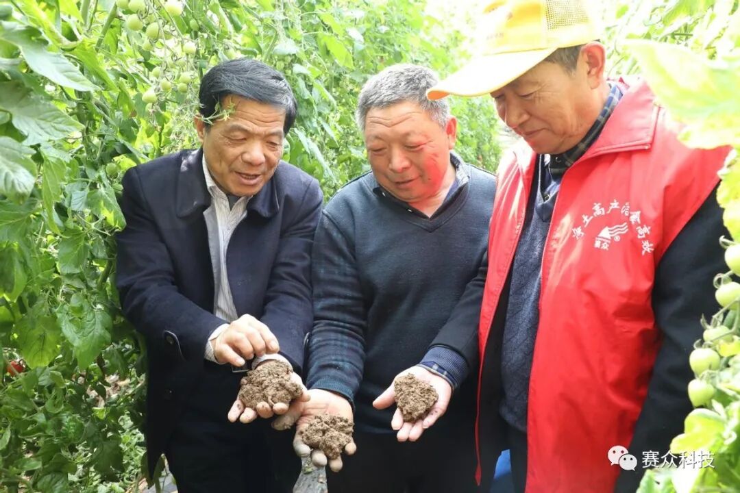 “打好土壤保卫战、寻找全国净土标兵”系列活动,自2019年4月开展以来,由陕西赛众公司专家和技术人员,以及来自《农资导报》《农业科技报》和中国农林卫视记者组成的测土小分队和寻找净土标兵采访团,深入田间地头,倾听种植者应用净土科技专利技术、创建健康田园、让耕地变成致富“金土”的亲身体会,查看他们防治土壤病、土传病害、净化土壤,提高农产品品质和产量,所取得的试验、示范成果,发现、挖掘出一批净土保健、优质高效典型事例。现将这些“净土标兵”的故事分享给大家,供学习借鉴。 设施大棚为农民带来高效益的同时,也带来了很多困扰。长期耕种会引起严重重茬病,要么弃棚,要么换土。但在山西新绛县北张镇北燕村,记者遇到了件新鲜事:种植20余年的蔬菜大棚从没换过土,1亩2分地产出圣女果高达4万余斤。棚主段春龙说起他的土壤管理经验如数家珍。 段春龙(中)展示棚内健康的土壤